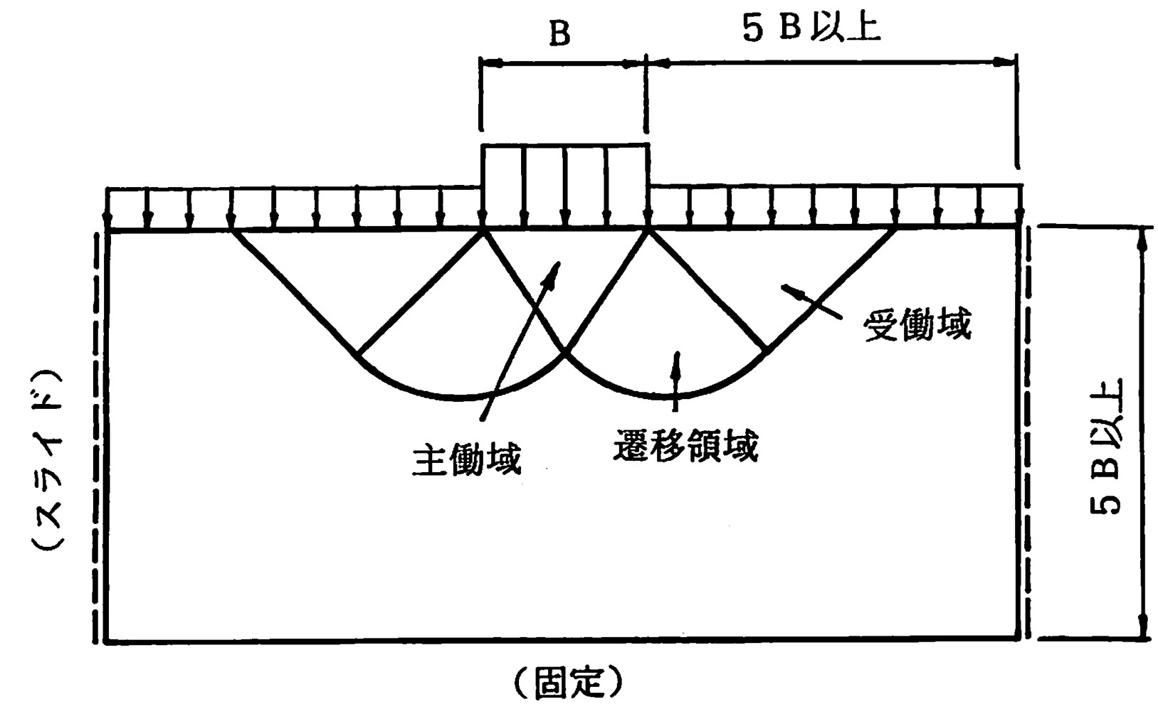 一方、テスト・ピット内における平板載荷試験によって地盤の許容鉛直支持力を求める場合、上載荷重の影響が入らないように、粘性土の場合、基礎幅の1.5倍、ゆるい砂の場合2.5倍、締まった砂の場合4倍以上テスト・ピットの内壁から離すよう道路橋示方書(下部構造編)に記載されている。これらのことを考慮し、定性的な変形モードを掴もうとするのであるなら、領域幅は、