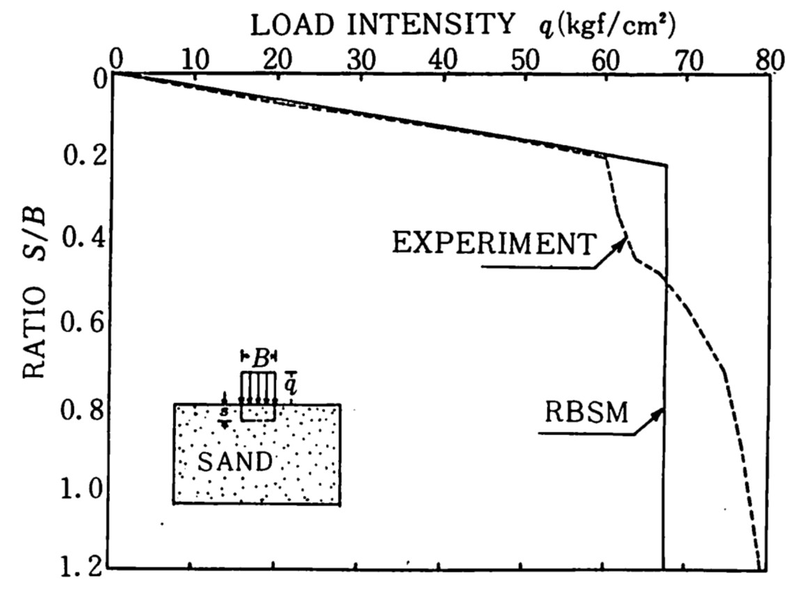 地表面が水平で、均一の材料から構成される地盤の支持力は極限解析により理論的に求められる場合が多い。しかし、実際の地盤は複雑な地層から構成されているため簡単に極限支持力を求めることができない。ここでは、このような種類の違う材料から構成されている地盤の支持力に関する解析を行い、実験結果と比較する。