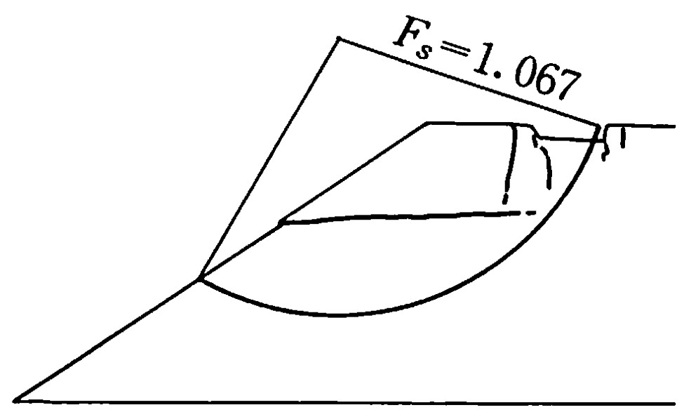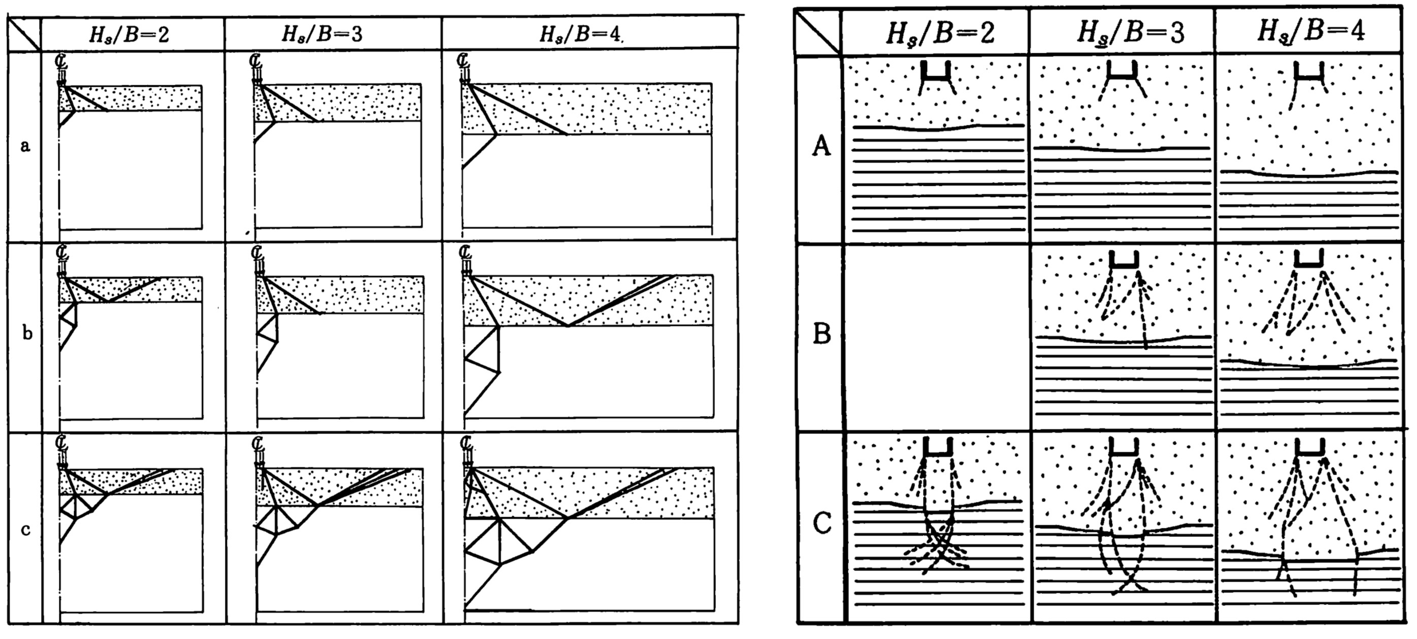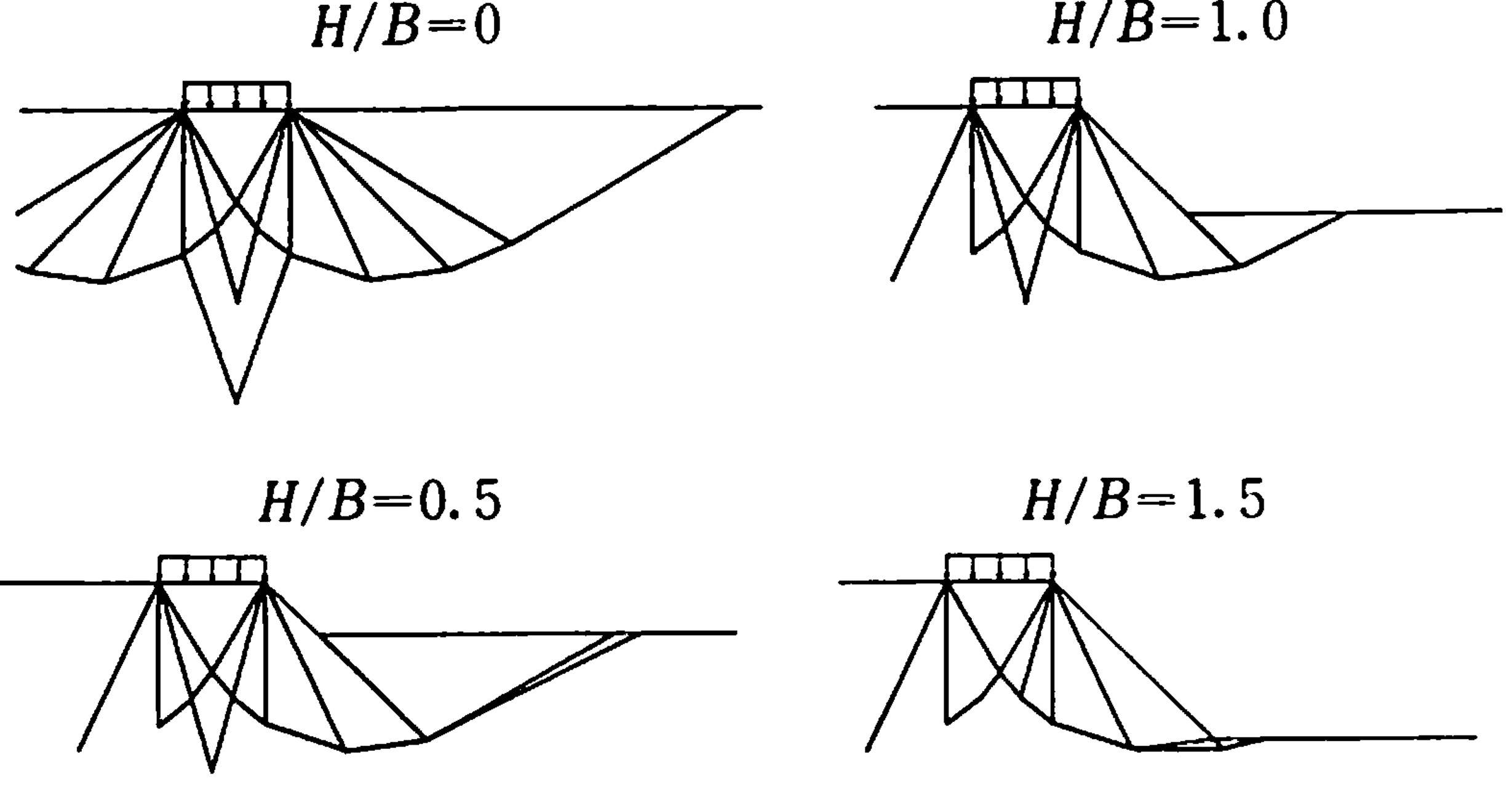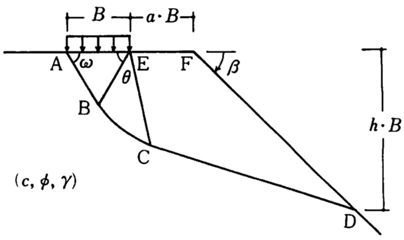 斜面高と基礎幅の比 $(H/B)$ がさらに小さくなると、斜面内にあったすべり線は斜面下に移動する。この場合、先の支持力公式は適用できなくなる。一方、$H/B=O$ の場合(水平地盤)についてはTerzaghiによって支持力が求められている。