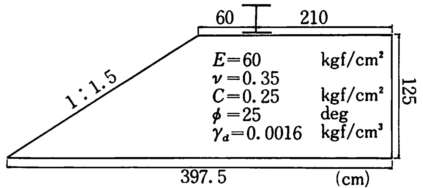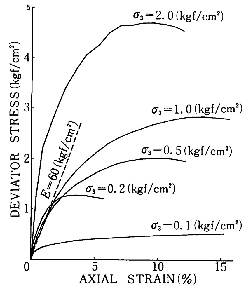 図4.25に示す三軸試験結果を用い、$\sigma_3 = 0.5 {\rm kgf/cm^2}$における1%の割線弾性係数 $E = 60 {\rm kgf/cm^2}$ とした。ただし、荷重増分法の場合、一般的には接線弾性係数を用いる傾向にある。