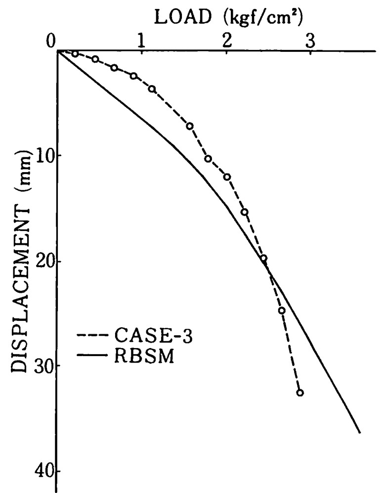 図4.29は荷重一沈下曲線を比較したもので、割線弾性係数を用いて計算しているため、若千柔らかめの挙動を示している。極限支持力は川井モデルによる場合、$3.611 {\rm kgf/cm^2}$、実験値が $3.11 {\rm kgf/cm^2}$ であり、約16%の誤差であった。