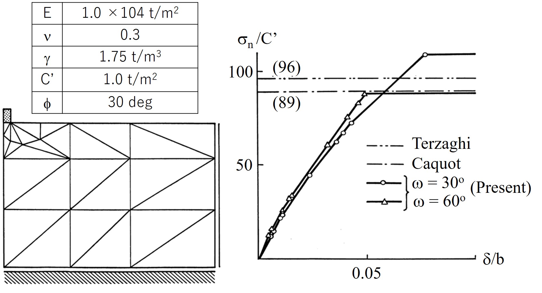 図(b)に $\omega=30^{\circ}$、 $\omega=60^{\circ}$ の場合の荷重ー沈下曲線を示す。この結果、$\omega=60^{\circ}$ とした場合の方が、$\omega=30^{\circ}$ より小さめの極限支持力を与えており、Caquotの値に近い。