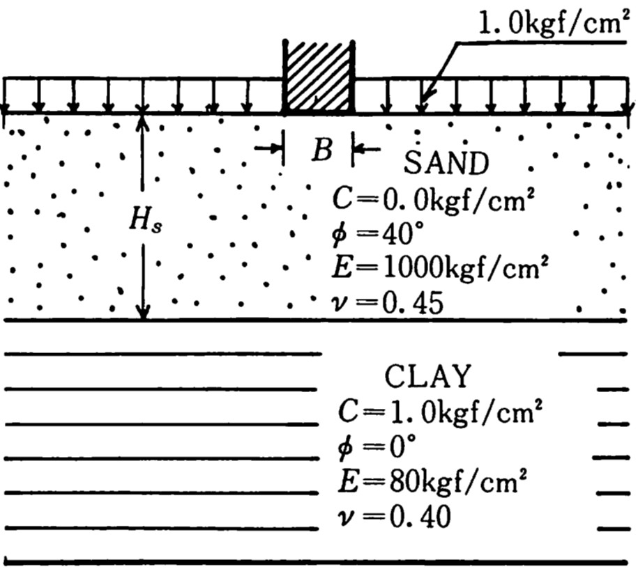 図4.9は上層が砂層、下層が粘土層で構成される2層系の地盤を表している。この2層地盤における実験結果と川井モデルによる解析結果を比較してみよう。実験では平面ひずみ条件のもと、上載圧 $1.0 {\rm kgf/cm^2}$ を図のように作用させている。解析では実験条件を考慮し、図に示すような材料定数ならびに上載圧を設定した。ただし、土の自重は無視している。非線形解析法は荷重増分法における山田の方法を利用し、破壊条件はモール・・クーロンの条件を用いた。また、応カーひずみ関係は完全弾塑性としている。載荷の順番は、上載圧を作用させ初期応力を求めた後、支持力としての荷重を作用させている。