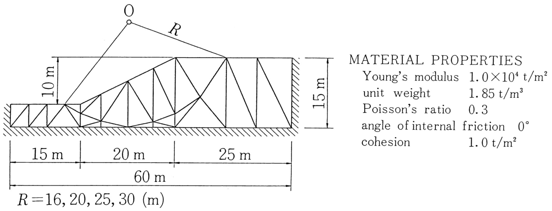 図5.10に示すような斜面を考え、半径 $R$ を変えることにより、安全率がどのように変化するか調べてみる。半径 $R$ は図に示すよう、$16、20、25、30 \; {\rm (m)}$ の4通りとした。要素分割ならびに境界条件については図に示す通りである。