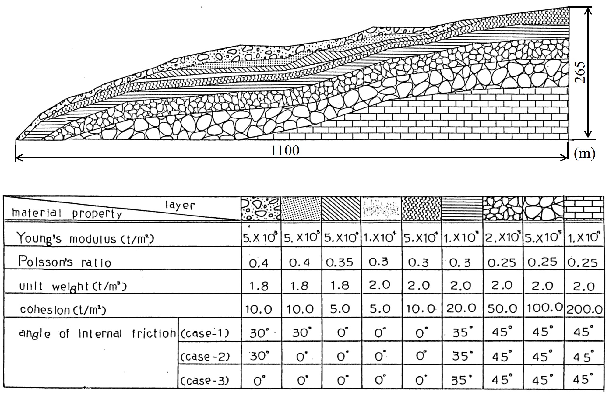 図5.13に解析に用いたモデル図と材料定数か示されている。材料定数表の中に計算を行ったケース番号が記載されている。ケース1は実際に地すべりが発生した付近の地層が地下水により飽和状態になったと仮定し、その部分の内部摩擦角を0とした例である。ケース2はさらに飽和領域が地表面近くまで増えたと仮定したもので,ケース3は完全に地表面まで飽和したと例である。