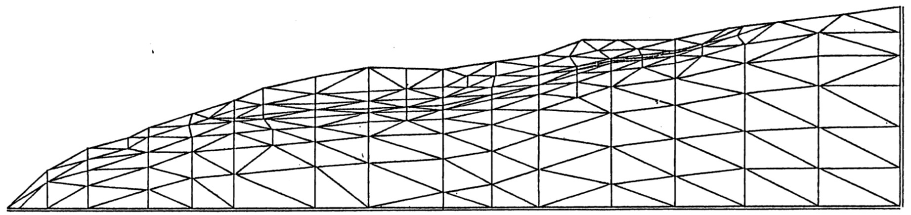 図5.12に示されるように、半径が $20、27.5、35 \; {\rm m}$ の円弧が含まれる極端な要素分割を行い、どのすべり線が卓越するか解析した。すべり線の状況は $27.5 {\rm m}$ の円弧より小さい円弧では斜面前方が破壊しやすく、逆に大きな半径の円弧では後方がすべりやすいという結果となっている。最も危険であると予想された $27.5 {\rm m}$ の円弧では全面にわたりすべり線が発生し、このすべり線によって斜面は崩壊する。このときの安全率は、先の安全率からも推測できるように0.366という値であった。