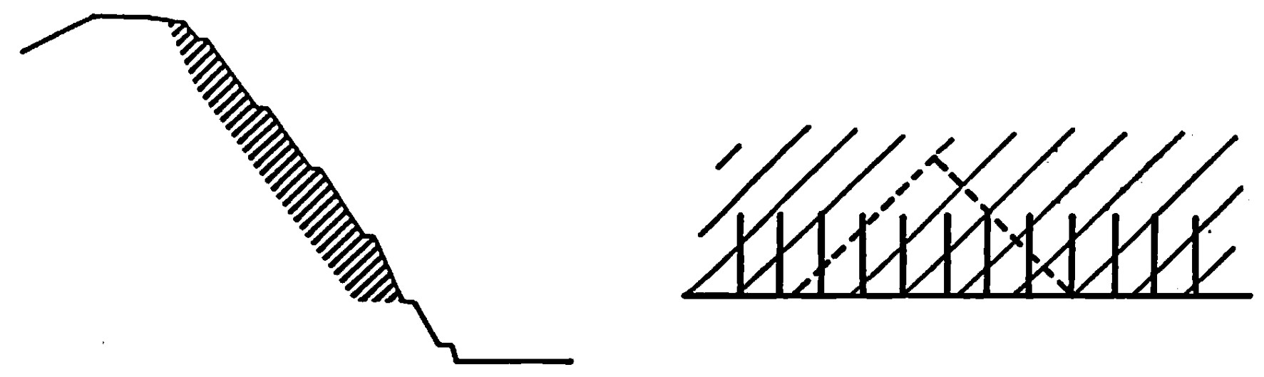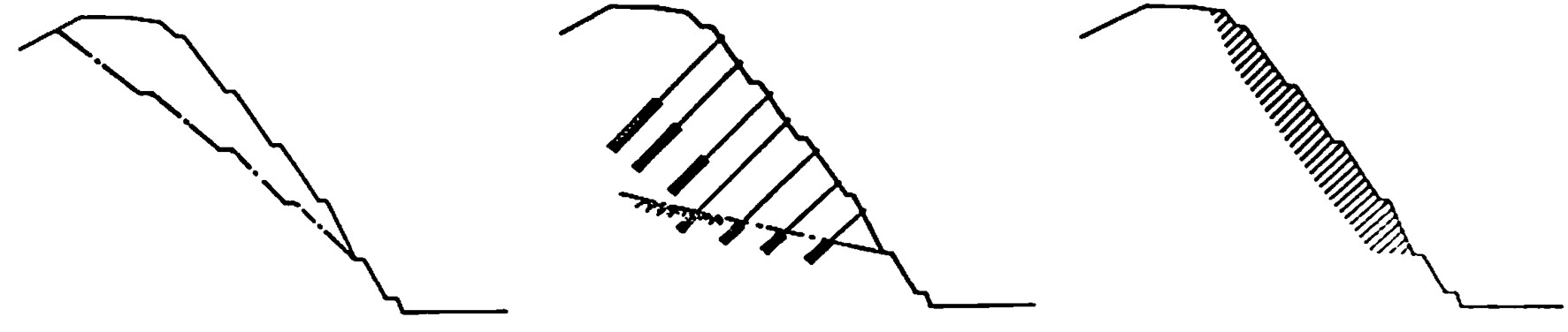 図(c)のロックボルトエは短いロックボルトを多数打ち込み、斜面構造をブロック化することで強度を上げる工法である。ここでは、このような法面保護工法のうち、アンカーエとロックボルト工を取り上げ説明する。