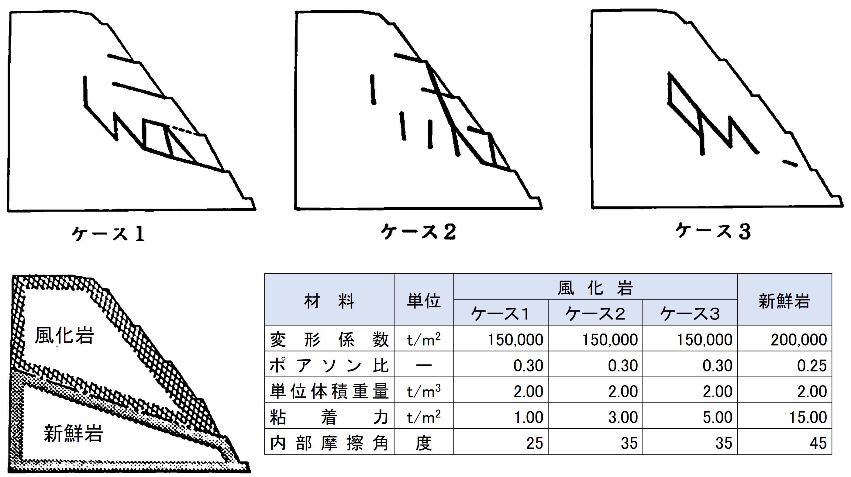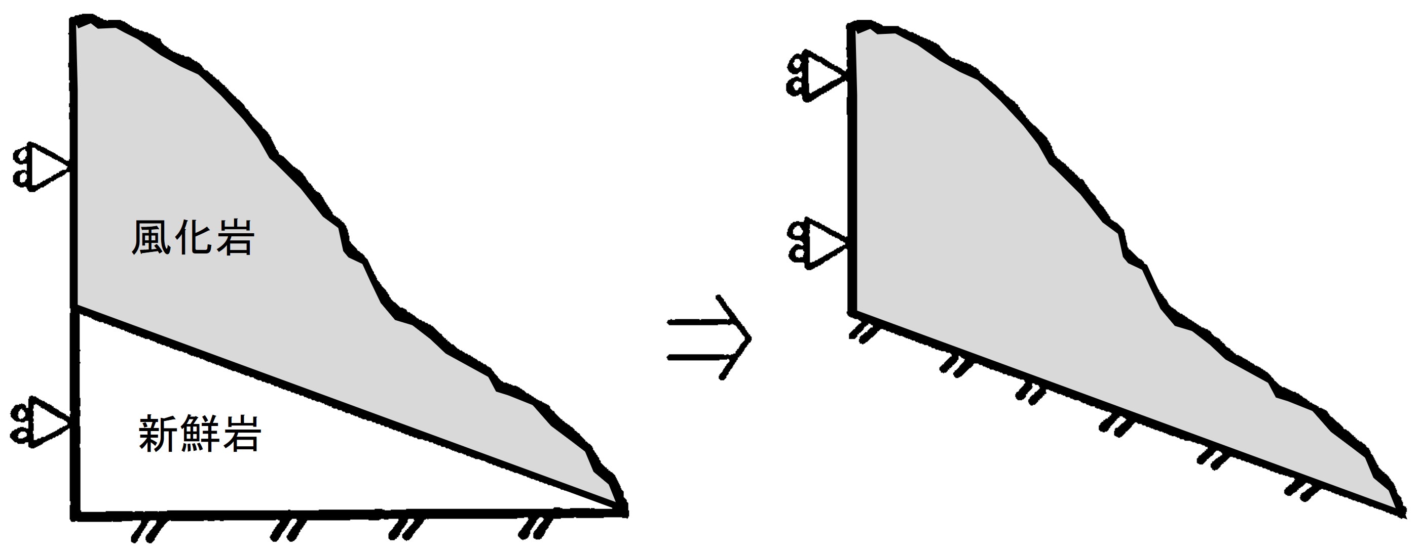 図5.2は新鮮岩の上に風化岩がある場合で、このような場合には図右のように解析領域を考える方法の他、簡便的に図左のように風化岩の部分を取り出して解析することもよく行う。安定解析に着目するなら、このような方法も要素分割が少なくてすみ有効である。ただし、解析を行った結果、重要なすぺり面が境界に達するようであれば、再度領域を見直す必要がある。