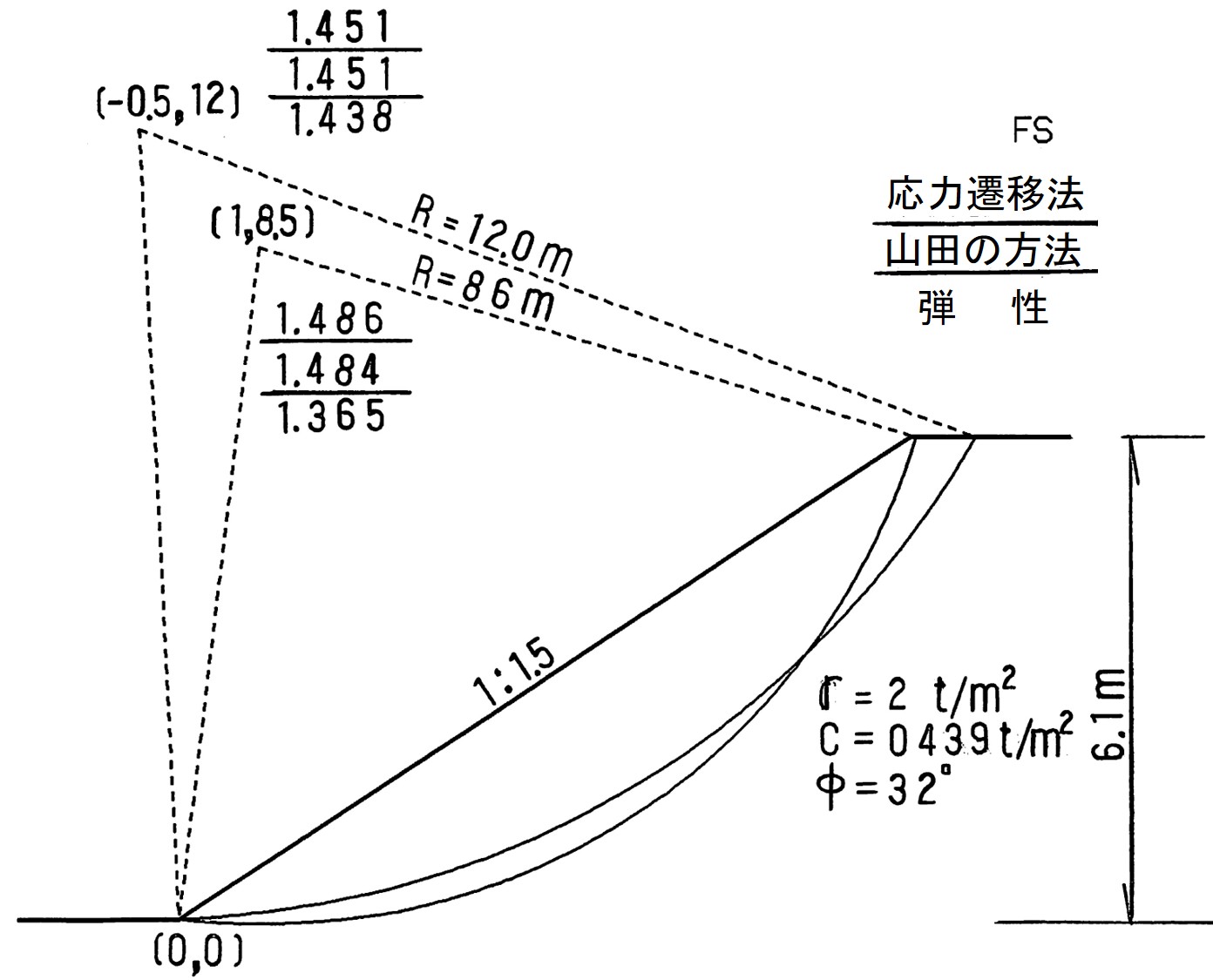 図5.27はモデル斜面において、弾性計算、山田の方法および反復法による計算を行い、各々の方法の最小安全率を与える位置と最小安全率の値を示したものである。なお、地盤は均ーで、材料定数は図中に示す通りである。また、本計算では間隙水圧を考慮していない。反復法と山田の方法による最小安全率を与える円弧中心位置は法先を原点として $(-0.5{\rm m}、12.0{\rm m})$ の位置にあり、最小安全率も $F_s = 1.45$ と全く同じである。一方、弾性計算の最小安全率の位置は図に示すよう、塑性計算の場合と異なり、また最小安全率についても約6%小さい値となっている。