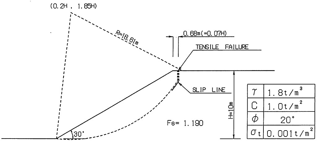 図5.33は反復法において引っ張り破壊を考慮した場合の引っ張りクラック発生位置の妥当性を検討した結果が示されている。高さ $H$、傾斜角度が $30^{\circ}$ の斜面において、地盤の内部摩擦角が $20^{\circ}$ で非排水状態にある場合、限界破壊円の中心は法先を原点として $(0.2H、1.85H)$ にあり、限界引張亀裂の位置は法肩より $0.1H$ の位置にある。図は、H=lOmとした場合の結果であり、引張破壊の位置は法肩より $0.68{\rm m}(0.07H)$ の位置にあり、引張破壊を起こした1箇所の底部よりすべり線が発生している。