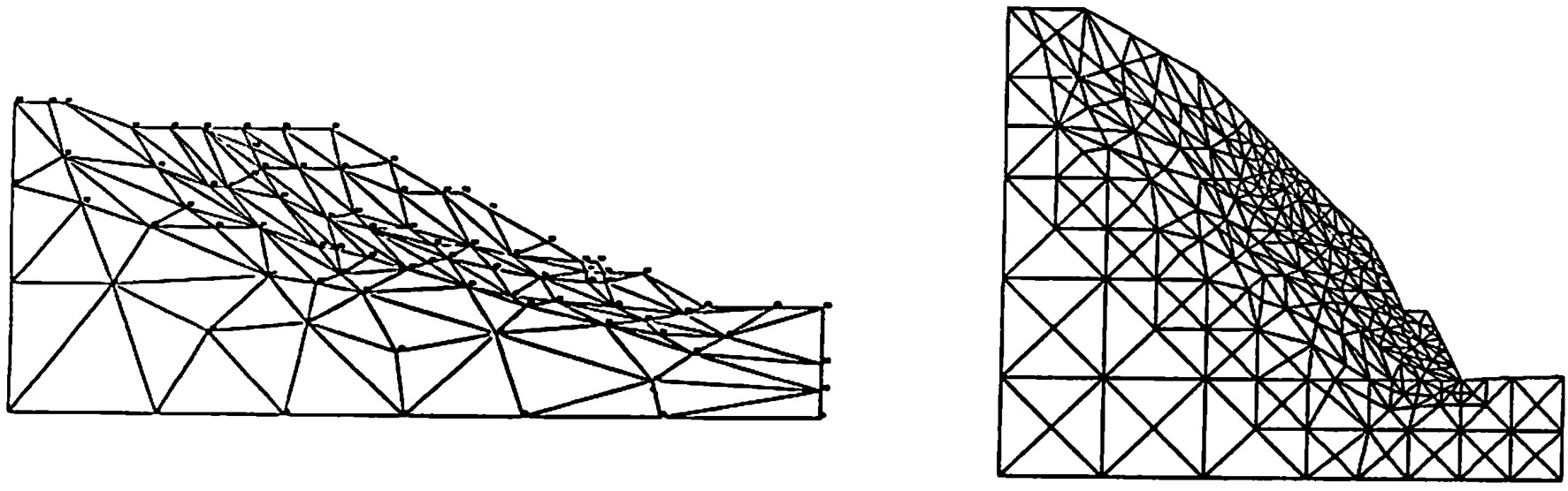 図(b)に示すよう、節理、層理に沿って要素分割を行えば、構造的な異方性を解析に考慮することができる。また、岩盤斜面の場合、風化の度合いが少ないほど要素分割を大きくすることにより、より現実的な解が得られる場合が多い。