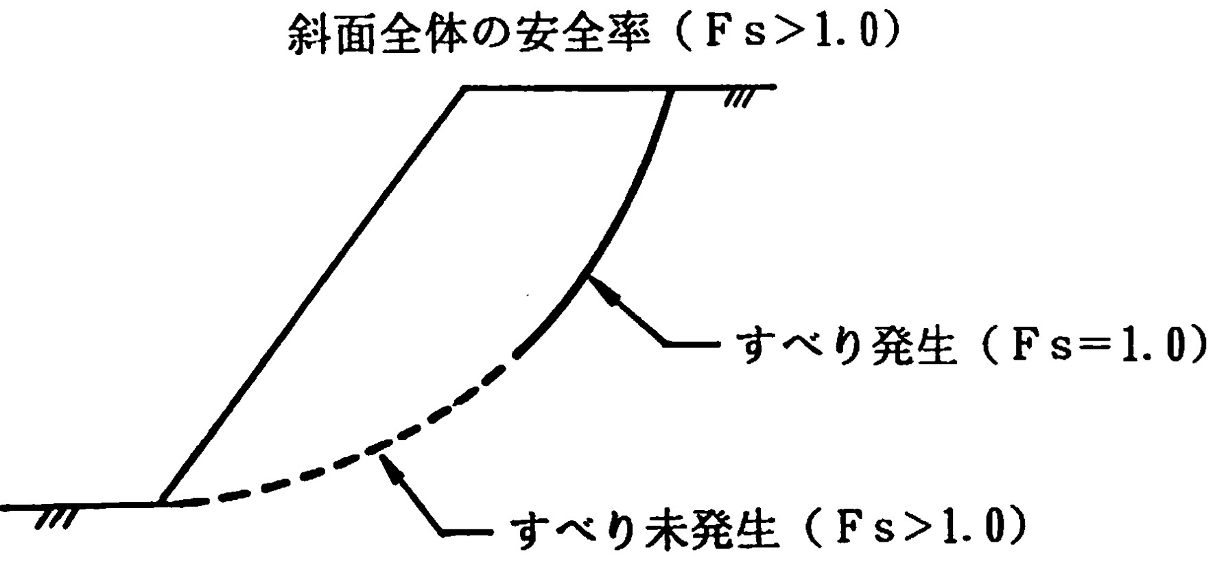 この関係は斜面全体の安全率が1.0より大きい場合、すなわち、斜面が崩壊しない場合のもので、もし、斜面が崩壊する場合には