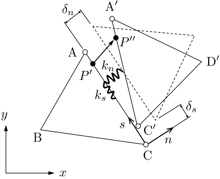 図2.3に示すようなペナルティ関数の設置箇所である.DDAでは,動解析を行いDEMと同様な接触を考えるため,実用上,