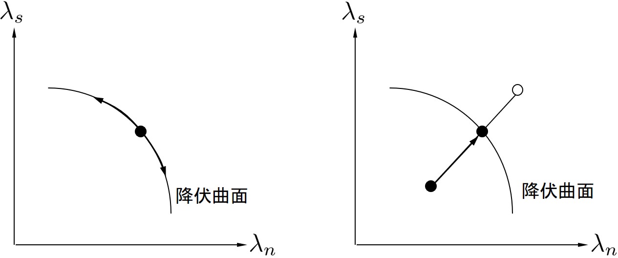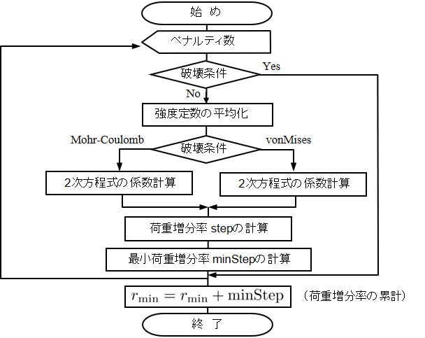 この判定で注意してほしいことはl422行と1429行においてせん断強さに0.998を掛けていることである.厳密にはこのような処理を行う必要はないが,実数計算の場合,丸め誤差等により本来1となるべき解が0.99…となってしまうことが度々ある.前節で説明した全表面力の計算も実数計算であるから,表面力が降伏曲面上に完全に一致することは少ない.