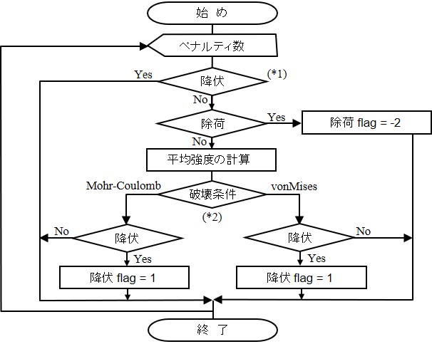 図に示す(*1)の判定は,すでに降伏状態にあるペナルティ辺か否かを判定している.降伏状態にあれば除荷が発生しない限り塑性状態を継続するものとしてフラッグの変更を行わない.もし,ペナルティ辺が降伏状態でなければ除荷状態か否かを判定し,除荷状態であれば以後弾性と見なし,フラッグを