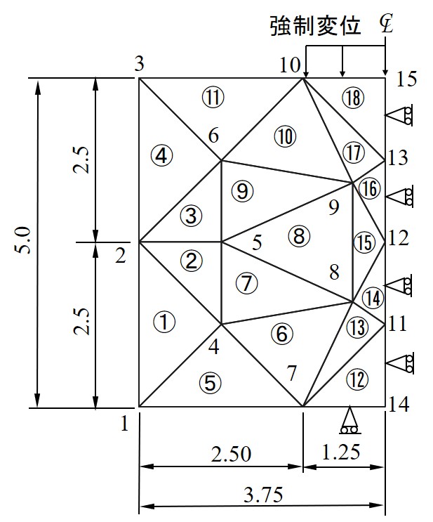 図7.1 に示すように左右対称であるため,全体の左側半分を解析モデルとして設定している.節点数が15節点,領域数(要素数)が18要素で,総自由度数は108自由度である.