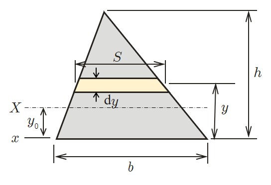 図3.1.4に示す三角形の $x-x$ 軸に関する断面1次モーメントと図心位置 $y_0$ を求めてみよう.