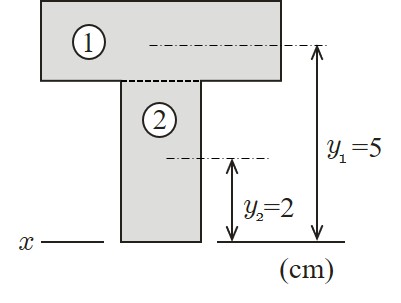 初めに図心位置 $(x_0, y_0)$ を求め,その図心位置と原点が一致する座標系 $(X-Y)$ に関する断面諸量を求める.計算にあたり,L型断面を2つの長方形断面①②に分割する.また,計算ミスを防ぐ意味でも,これまでと同様,表を用いて計算する.