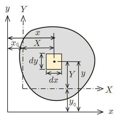 となる.座標系 $(x-y)$ から見た座標系 $(X-Y)$ の位置は $(x_0, y_0)$ で表されるため,座標系 $(x-y)$ による図心位置は $(x_0, y_0)$ である.したがって,任意の座標系 $(x-y)$ に関する図心位置は