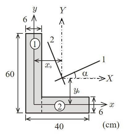 図3.4.2に示したL型断面の主軸方向および主断面2次モーメントを求めてみよう.