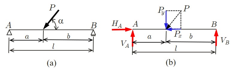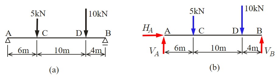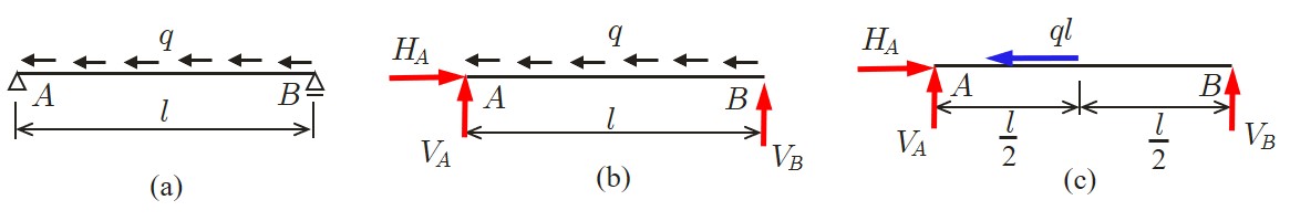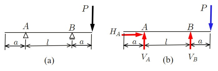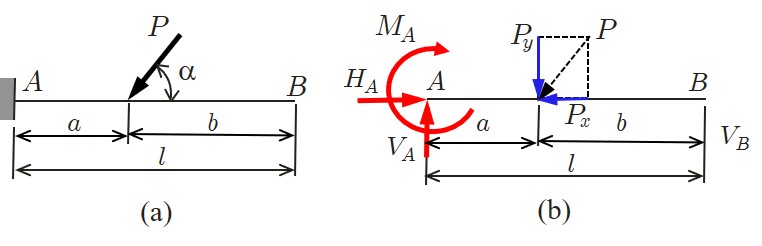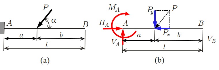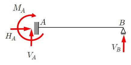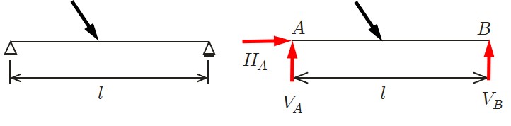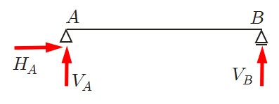 スパン (span)と呼ばれている.支点の記号を見ると,$A$ 端はヒンジ支承であるから,水平方向反力 $(H_A)$ と鉛直方向反力 $(V_A)$ に置換できる.一方,$B$ 端はローラー支承であるから鉛直方向反力 $(V_B)$ のみ生じる.