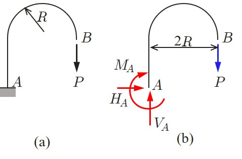 図4.2.5(b) に示すようなつり合い系が得られる.ここで,未知数は両端の反力6個であるが,つり合い条件式は3つであるため,未知数が方程式数より多くなり,解くことができない.このような問題を解くためには,つり合い条件以外に変形に関する条件を考慮しなければならない.