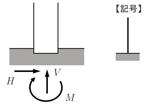 水平方向反力 $(H)$,鉛直方向反力 $(V)$,モーメント反力 $(M)$ の3つの反力が発生する .解析用のモデル図における固定支承の記号は図のとおりである.