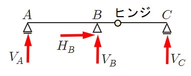 図の構造における反力は4つであるため,ヒンジ点において曲げモーメントが0になることを利用し以下のつり合い条件式をたてる.