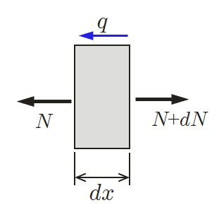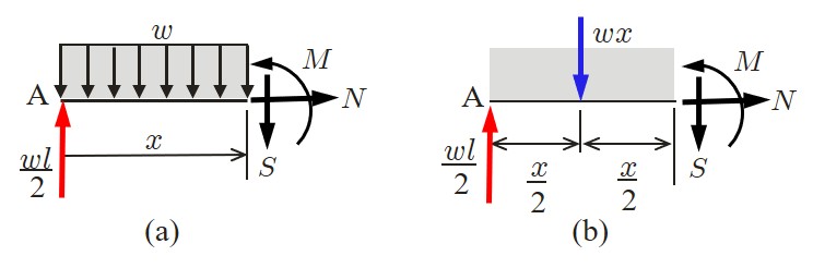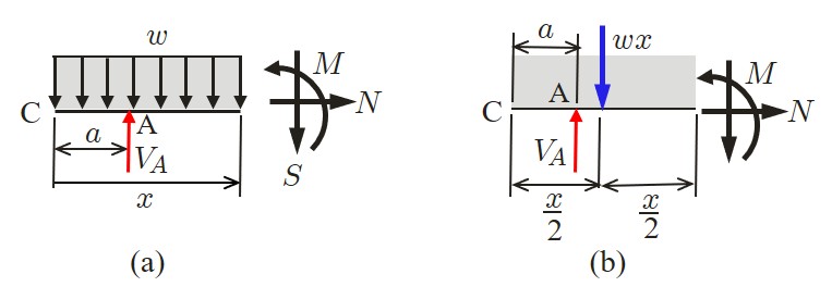 分布荷重は単位長さあたりの荷重量を示すため,集中荷重の単位が $({\rm N})$ であるのに対し,$({\rm N/m})$ により表される.また,集中荷重における力のモーメントと同様,分布荷重のなかには分布モーメントもある.