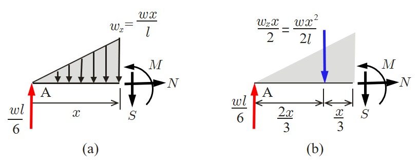\sum M = 0 &:& \displaystyle M = -\frac{wx^2}{2}+ V_A(x-a)