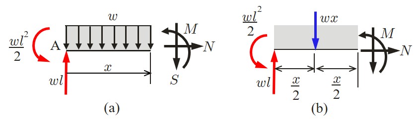 \sum M = 0 &:& \displaystyle M = -\frac{wx^2}{2}