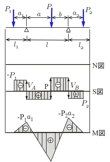 張出しばりの断面力は,通常の単純ばりや片持ばりと同様に全体構造をそのまま考えてつり合い方程式により解く方法(方法1)と,単純ばり部は単純ばりとして,片持部は片持ばりとして別々に解いた後重ね合わせる方法(方法2)の2通り求め方がある.