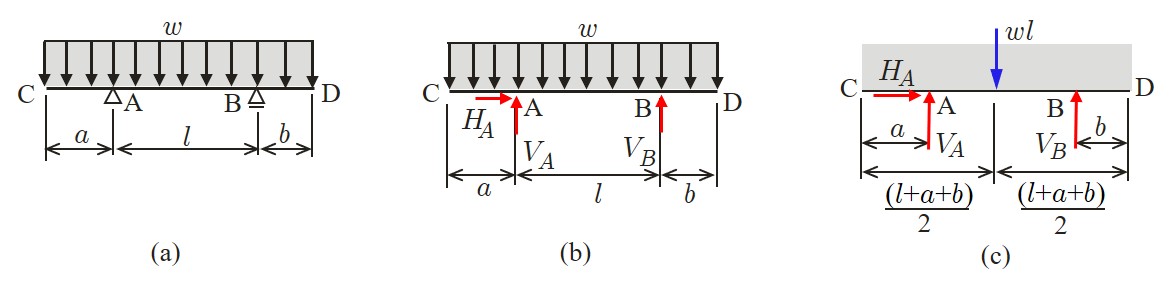 $\hspace{3em}{\rm (a)}$単純ばり $\hspace{8em}{\rm (b)}$支点反力