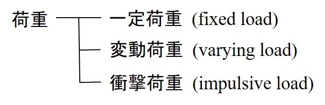 一定荷重は荷重そのものの大きさが時間により変化しないもので,例えば静止荷重や移動荷重が上げられる.また,変動荷重は荷重の大きさが時間とともに変化し,繰り返し作用するものをいい,例えば,風荷重や地震力がある.衝撃荷重は変動荷重と同様,荷重の大きさが時間とともに変化するが,その作用時間が微小で衝撃を伴うという点に特徴がある.自動車などの衝突はそのよい例である.