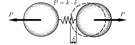 図1.1に示すような極端に理想化された剛体-ばね系を考える.この例は,二つの剛体が1本のばねにより結合され,単純に一軸引つ張りを受けた場合のモデルである.剛体は変形しないかわりにばねが伸び,このばねにエネルギーが蓄えられる.この概念を2次元,3次元へと拡張し,ばねの種類も単純に引つ張り,圧縮に対するもののみならず,すべりなどのせん断に抵抗するようなばねを導入したモデルがRBSMである.