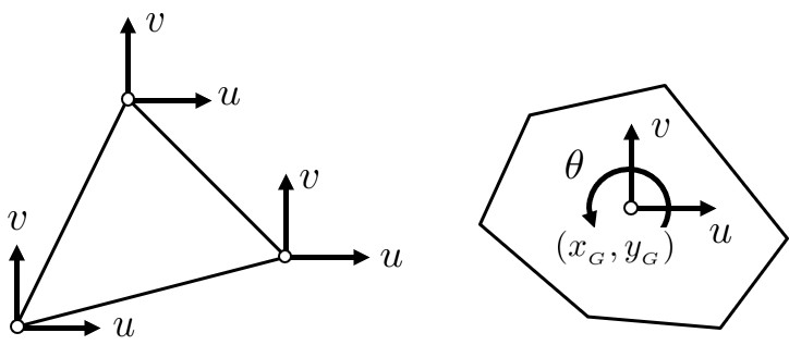 FEMの定ひずみ要素では三角形の各頂点に自由度を設定し,各々の節点に 方向の平行変位 $(u,v)$ の2自由度を考える.