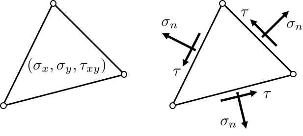 図1.4(a)に示すように,節点における変位から要素毎に要素内の応力 $(\sigma_x, \sigma_y, \tau_{xy})$ を計算する.