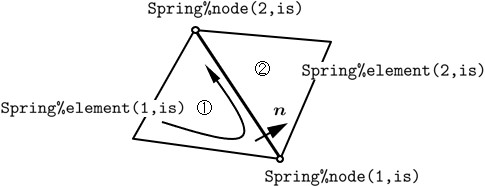節点数を(same) という変数により調べ,この値が2のときばねが存在すると考える.もし,この値が3であれば,それは2つの要素が全く同じ要素構成節点番号を持っていることになり,明らかに要素デー夕にミスがある.また,1以下の場合はデータのミスではなく,共有する要素境界辺が存在していないことを意味する.