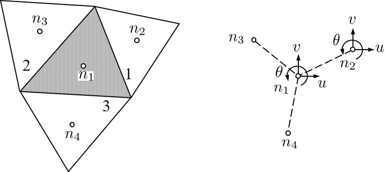 図4.2(a) のように三角形の場合にはFEMにおける定ひずみ要素のデー夕構造と全く同じになる.