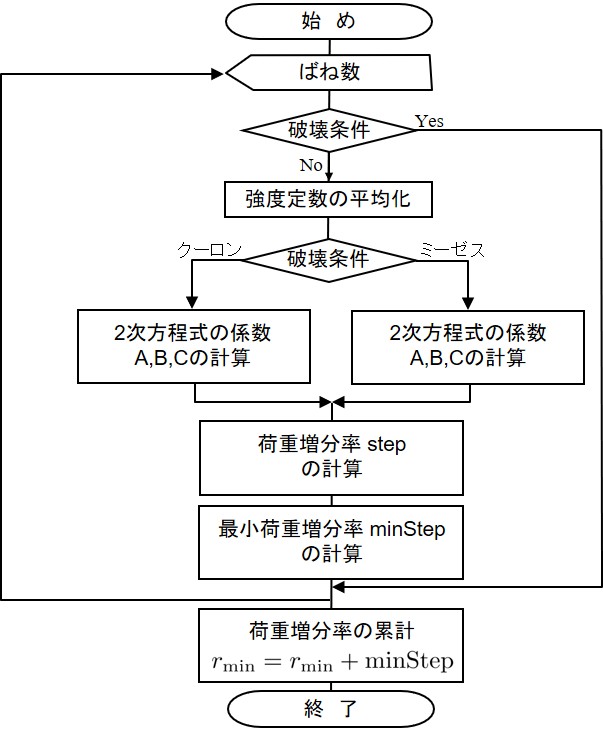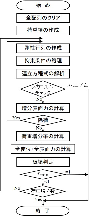 最後に,荷重増分率を計算し,全変位及び全表面力を求め,それを今回の値として破壊状態を調べる.荷重増分率の累計が1になったら,全荷重が作用し終わったものとして計算を終了させる.荷重増分率が1以下ならさらに載荷を行い上記と同様な手順を繰り返す.