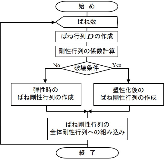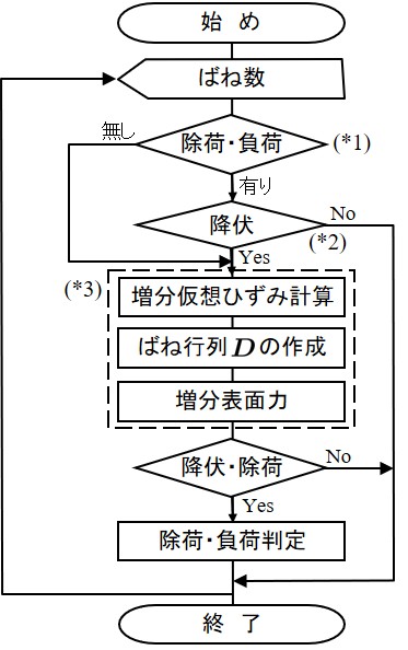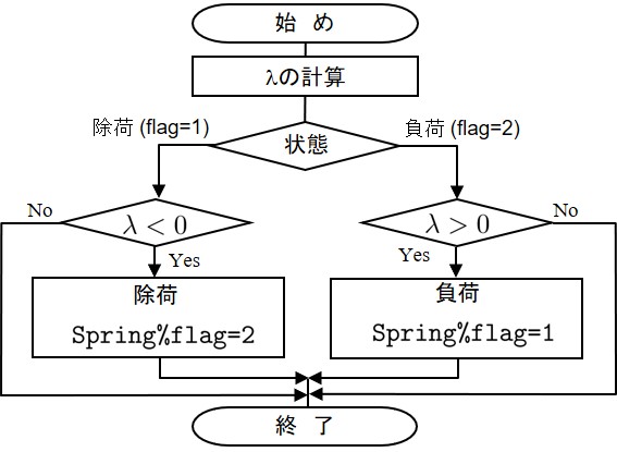 山田の方法を用いた荷重増分計算では増分計算毎に塑性化したばねの剛性行列を作成し直す.このためには,前回のばね状態が弾性状態か塑性状態か,あるいは除荷状態か負荷状態かを把握しておく必要がある.この判定の流れを示したものが