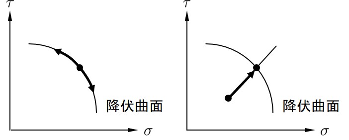 この判定で注意してほしいことは1257行と1264行においてせん断強さに0.998を掛けていることである.厳密にはこのようなことを行う必要はないが,実数計算の場合,丸め誤差等により本来1となるべき解が0.99…となってしまうことが度々ある.前節で説明した全表面力の計算も実数計算であるから,表面力が降伏曲面上に完全に一致することは少ない.