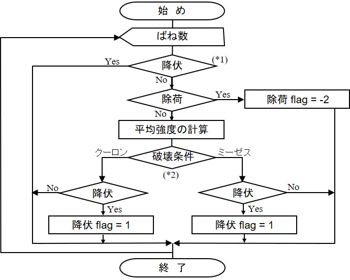 図に示す(*1)の判定は,すでに降伏状態にあるばねか否かを判定している.降伏状態にあれば除荷が発生しない限り塑性状態を継続するものとしてフラッグの変更を行わない.もし,ばねが降伏状態でなければ除荷状態か否かを判定し,除荷状態であるば以後弾性と見なし,フラッグをSpring%flag = -2にセットする.(*2)の判定文は今回の表面力が降伏しているか否かの判定で,もし,降伏していればフラッグを1とし,以後,塑性としての取り扱いをする.このフローをプログラム化したものが