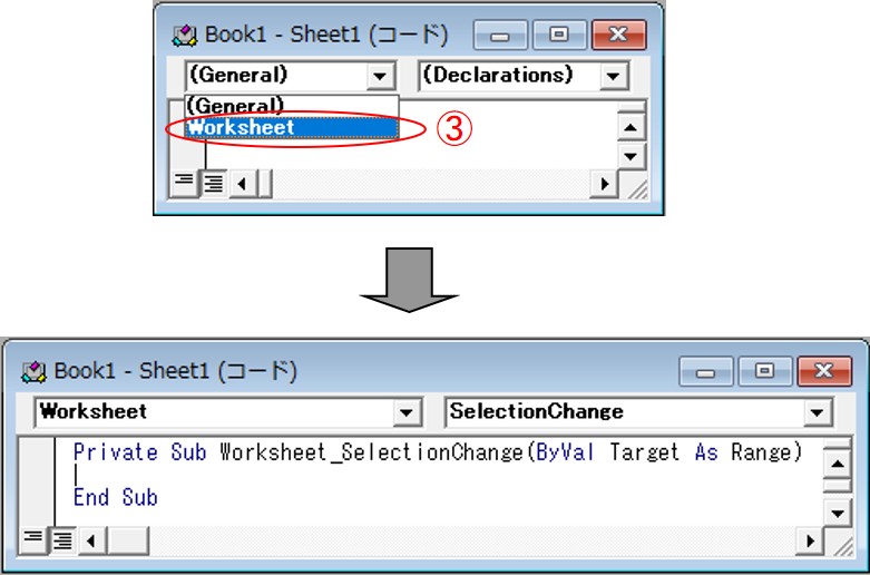 - ③ 図1-13上段に示すようにコードウィンドウのオブジェクトボックスから「Worksheet」を選択すると,図1-13下段のようにプロシージャボックスの表示が "SelectionChange" に変わり,コードウィンドウに図のようなステートメントが表示される.