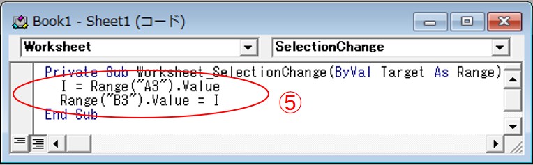 - ⑪ 図1-25に示すプログラムを入力する.このマクロは,ボタンが押されるとセルA3の値がセルB3に表示されるプログラムである.