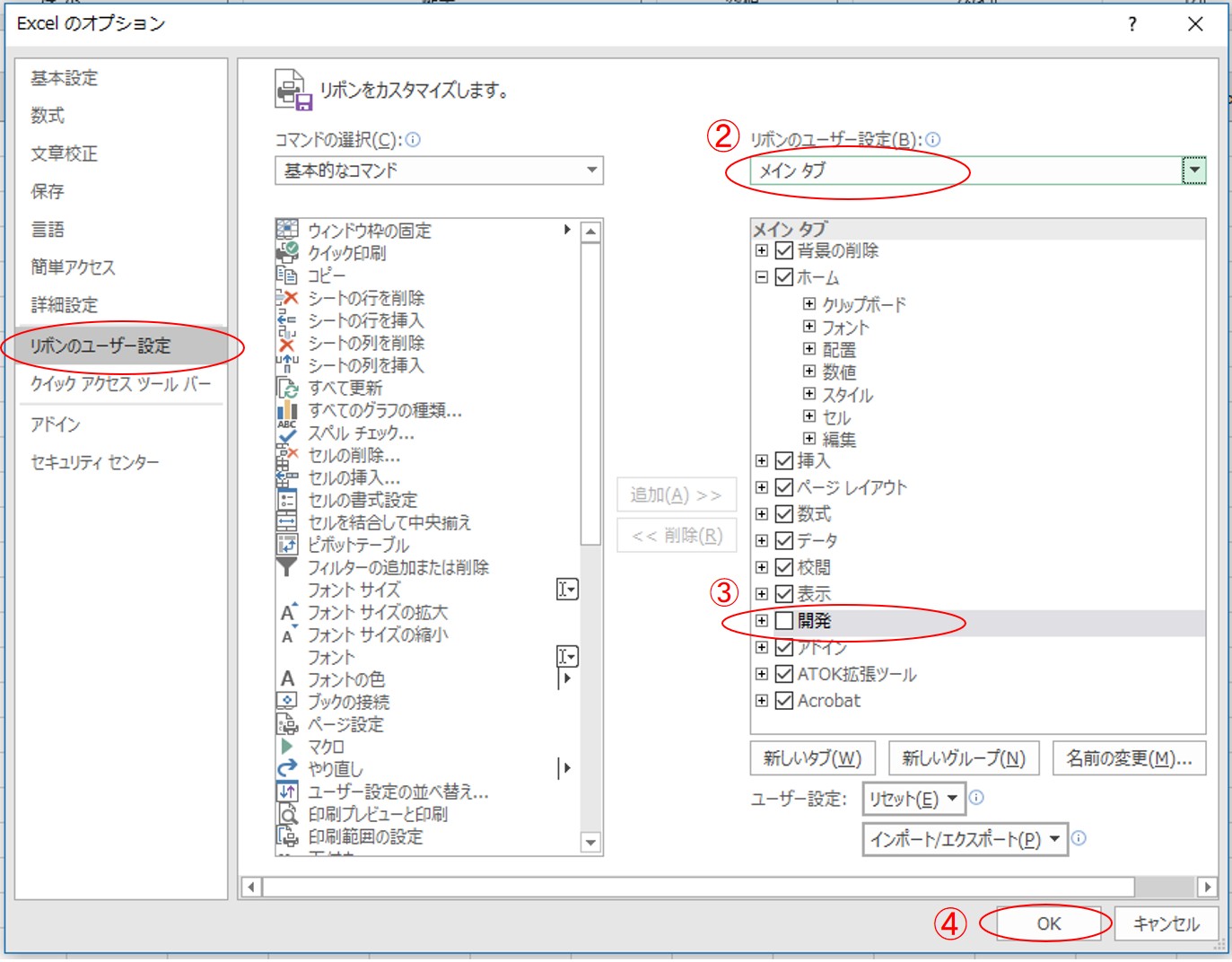 - ② 図1-2に示すダイアログボックスが表示されたら,右側の「リボンのユーザー設定」で「メインタブ」を選択する.