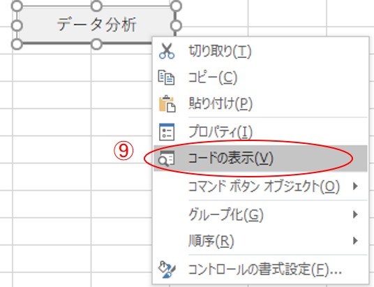 - ⑨ 作成したCommandButton1にマウスカーソルを移動し,右クリックすると,図1-23に示すメニューが表示されるので,メニューから「コードの表示」を選択する.(作成した「コマンドボタン」をマウスの左ボタンでダブルクリックしてもよい.)