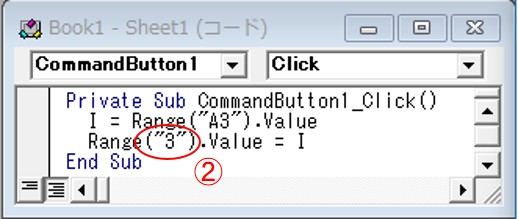 - ② 図1-25にように正常に動作するプログラムを,図1-27に示すように修正する.このプログラムの2行目のRangeの範囲が「3」となっており誤りである(正しくは「B3」).