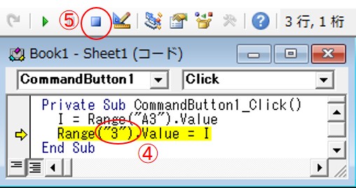- ④ コードウィンドウにおいて,エラーの行が図1-29のように,黄色の網掛けで表示されるので,誤りを見つけて修正する.この例の場合は,図の「3」を「B3」に修正する.