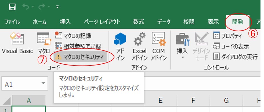 - ⑥ 実行できるマクロと実行の条件を指定するため,図1-3に示すリボンの「開発」タブを選択する.
